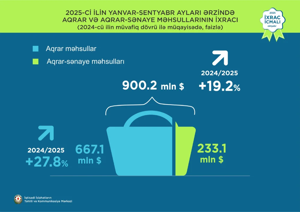 2025-ci ilin yanvar-sentyabr aylarında aqrar məhsullar üzrə ixrac 27,8% artaraq 667,1 milyon ABŞ dolları, aqrar-sənaye məhsulları üzrə ixrac isə 233,1 milyon ABŞ dollarına bərabər olub. Bütövlükdə aqrar və aqrar-sənaye məhsullarının birgə ixracı 19,2% artaraq 900,2 milyon ABŞ dolları təşkil edib.