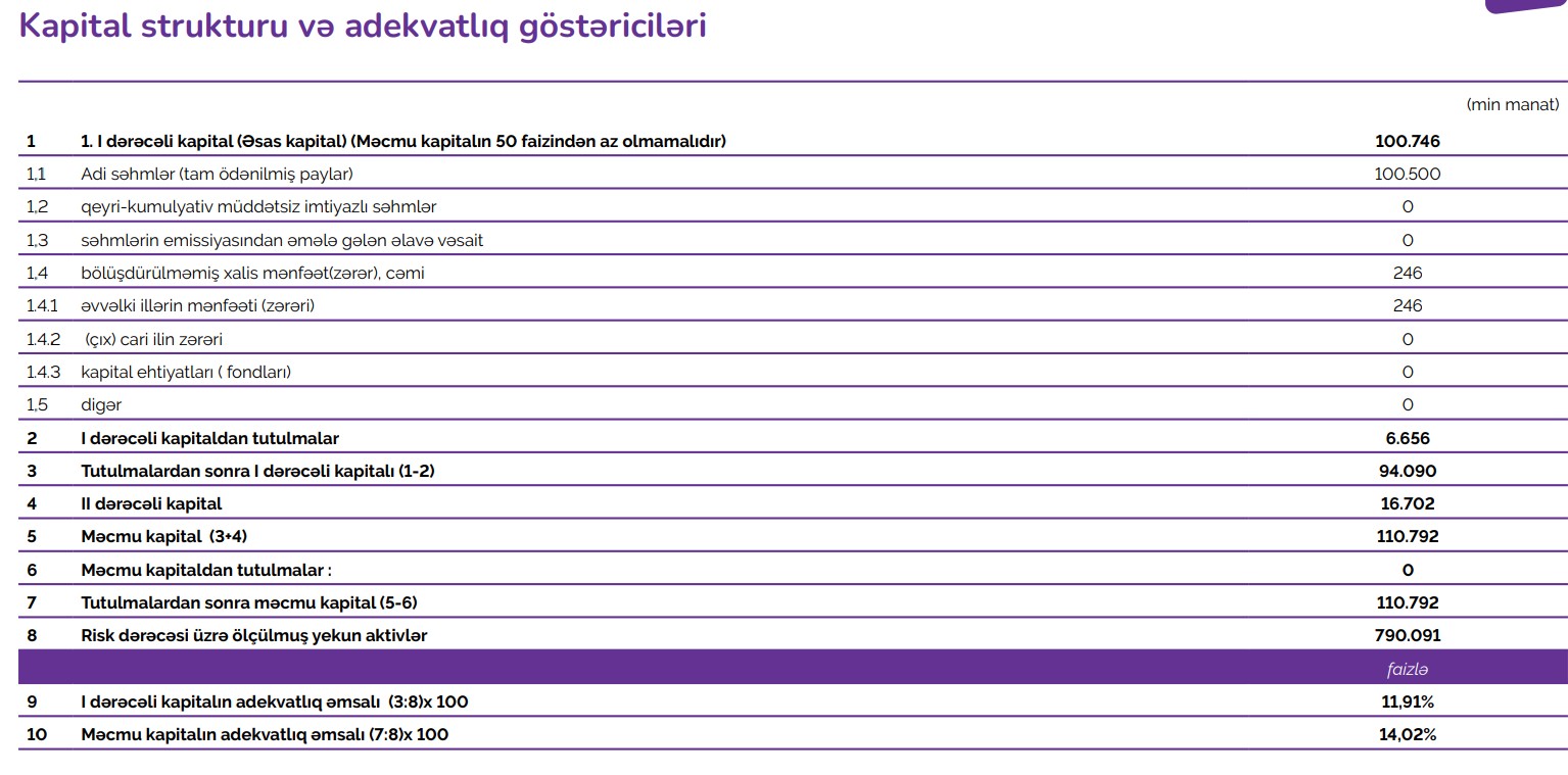 2025-ci ilin sonuna Azər Türk Bankın məcmu kapitalı 110 milyon 792 min manat təşkil edib. Bu göstərici 2024-cü ilin sonundakı 98 milyon 876 min manatla müqayisədə 11 milyon 916 min manat və ya 12 faiz artıb.