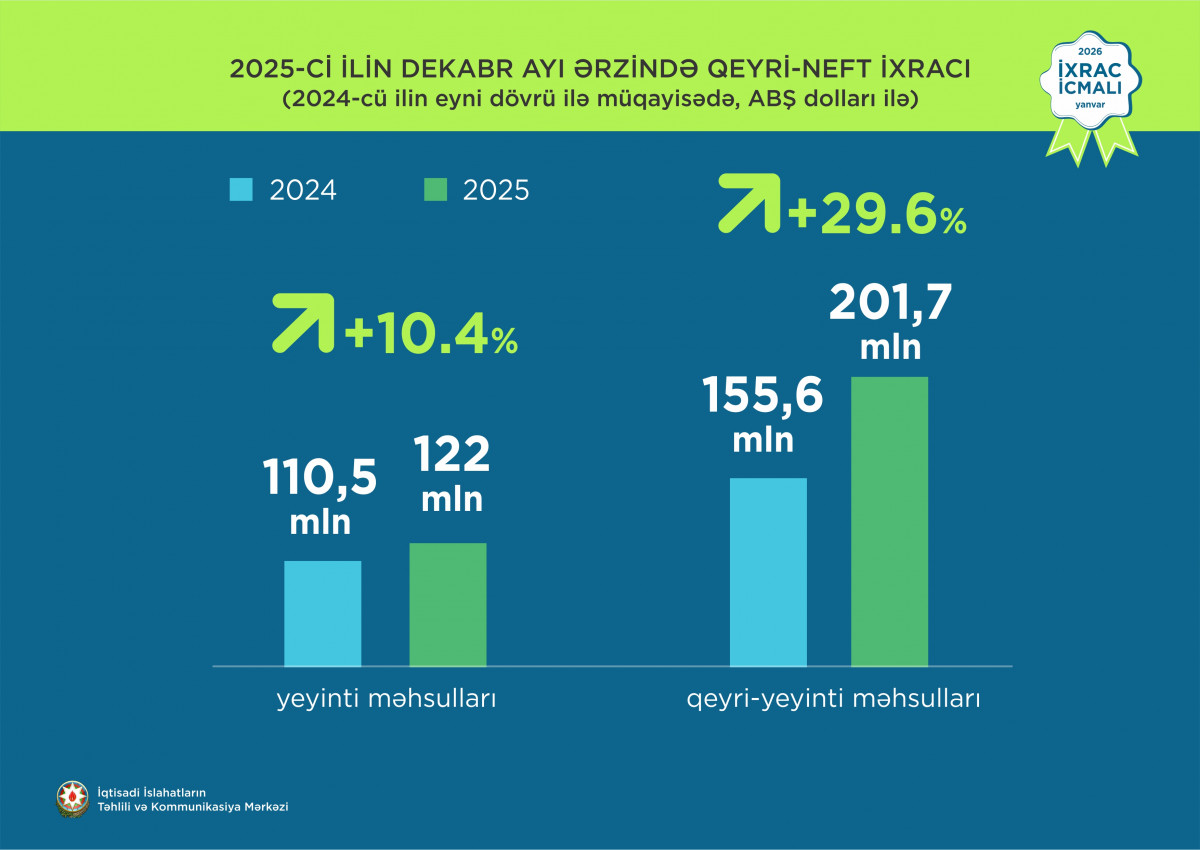 2025-ci ilin dekabr ayı ərzində ixrac edilmiş qeyri-neft sektoruna aid malların siyahısında xurma (36,4 milyon ABŞ dolları) birinci olub. Bu siyahıda qızıl (29,2 milyon ABŞ dolları) ikinci, qabığı təmizlənmiş meşə fındığı ( 20,3 milyon ABŞ dolları) isə üçüncü yerdə qərarlaşıb.