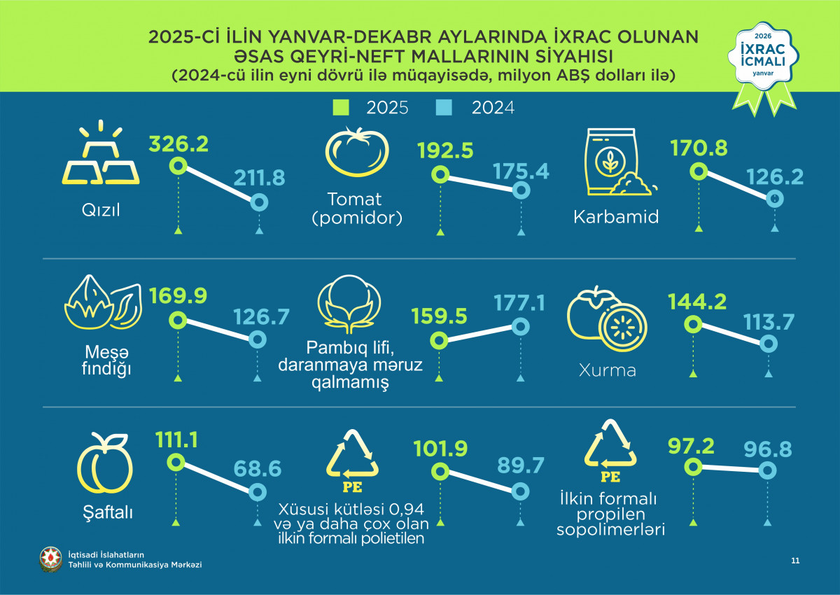İqtisadi İslahatların Təhlili və Kommunikasiya Mərkəzinin (İİTKM) nəşr etdiyi “İxrac icmalı”nın 2026-cı ildə ilk buraxılışı ötən ilin yekunlarına həsr olunub.