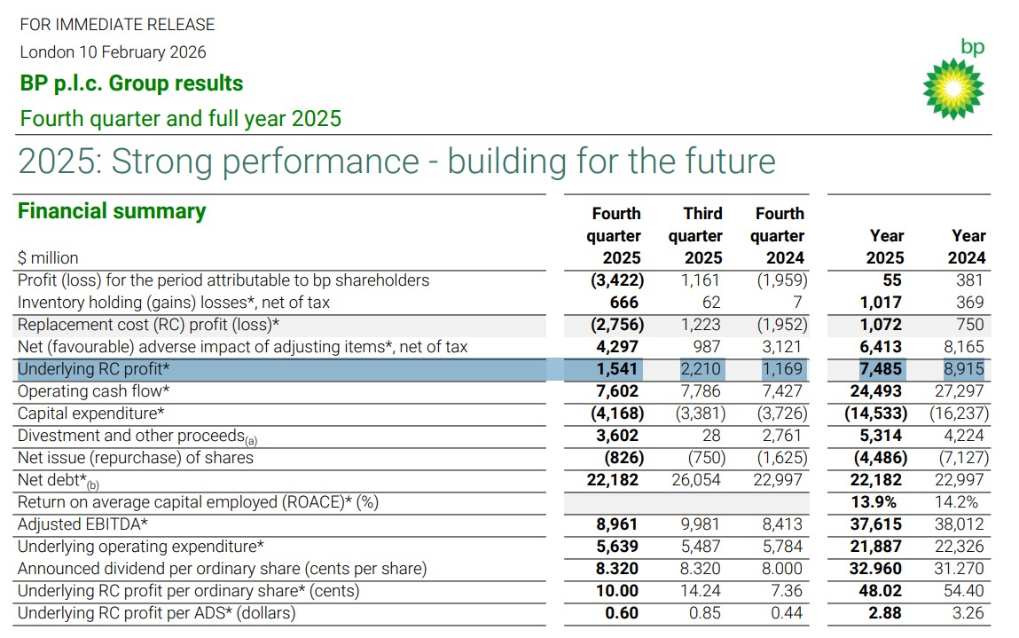 Şirkətin açıqladığı 2025-ci il maliyyə hesabatına görə, bp-nin ötən il mənfəəti zəif neft qiymətlərinə baxmayaraq 7,48 milyard dollar olub.