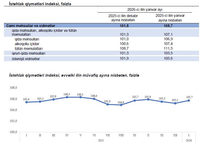 Qeyd edilib ki, 2026-cı ilin yanvar ayında istehlak qiymətləri indeksi (inflyasiya göstəricisi) 2025-ci ilin yanvar ayına nisbətən 5,7 faiz, o cümlədən qida məhsulları, alkoqollu içkilər və tütün məmulatları üzrə 7,1 faiz, qeyri-qida məhsulları üzrə 3,5 faiz, əhaliyə göstərilmiş ödənişli xidmətlər üzrə 5,6 faiz artıb. 2025-ci ilin dekabr ayında istehlak qiymətləri indeksi 2024-cü ilin dekabr ayına nisbətən 5,2 faiz artmışdı.