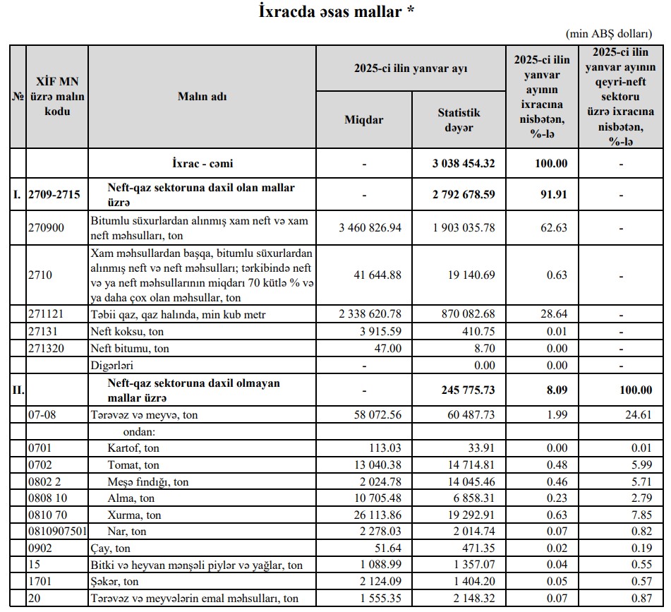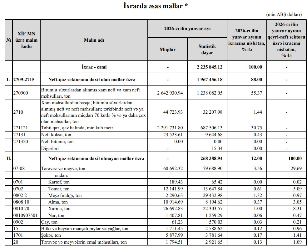 2026-cı ilin Yanvar ayında Azərbaycanın ixracının dəyərinin 88%-i neft-qaz sektoruna daxil olan mallar, 12%-i neft-qaz sektoruna daxil olmayan mallar üzrə formalaşıb.