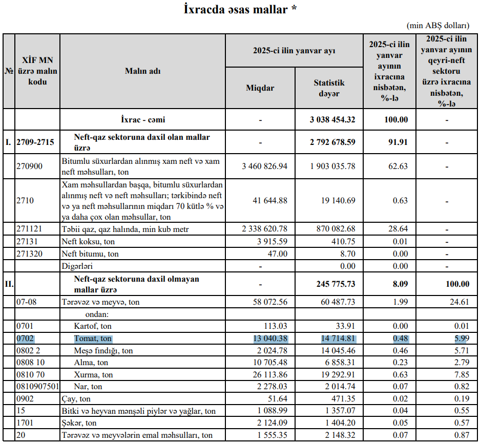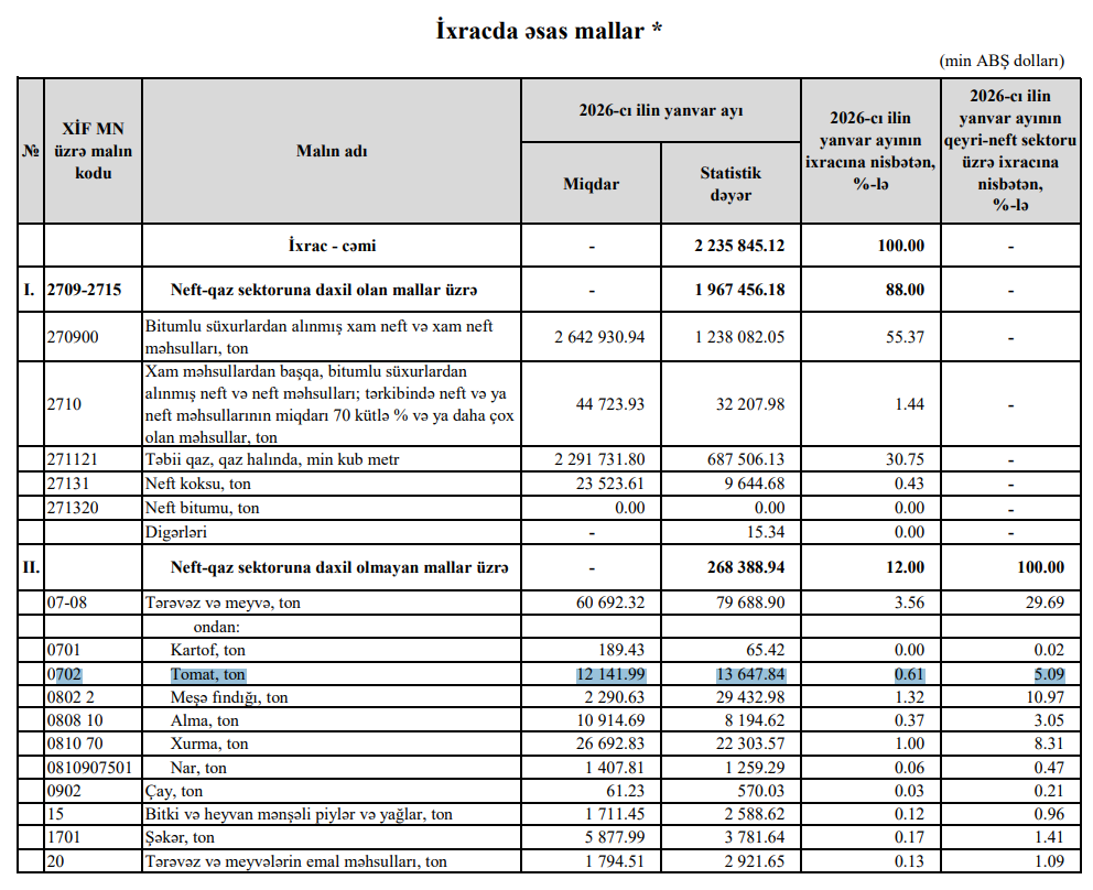 Beləliklə, Azərbaycandan pomidor ixracı 2026-cı ilin Yanvar ayında 2025-ci ilin Yanvar ayı ilə müqayisədə dəyər ifadəsilə 1 milyon 67 min dollar və ya 7,2% , miqdar ifadəsilə 899 ton və ya 6,9% azalıb.