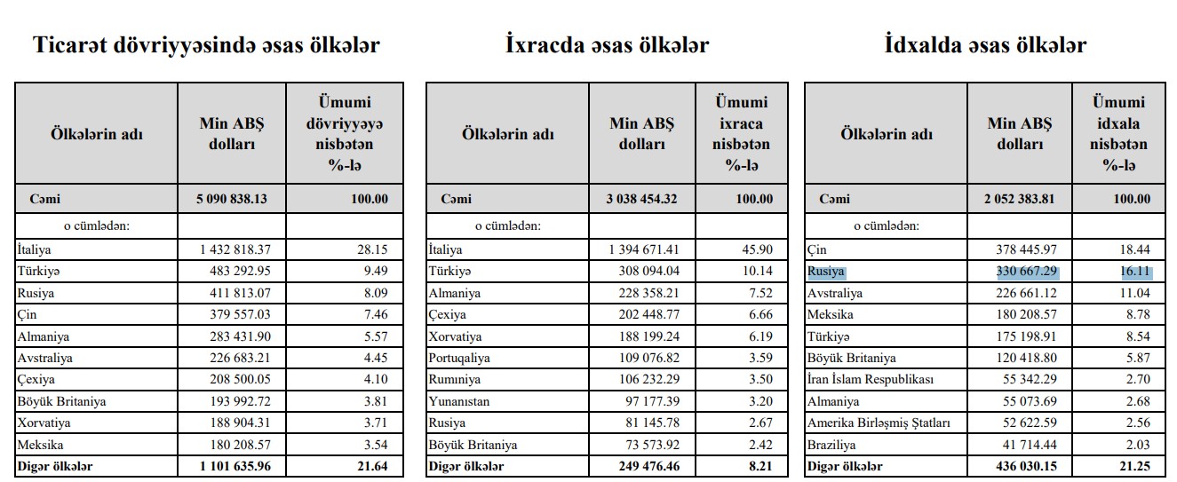 Azərbaycanın Rusiyadan idxalının dəyəri 2 dəfə azalıb