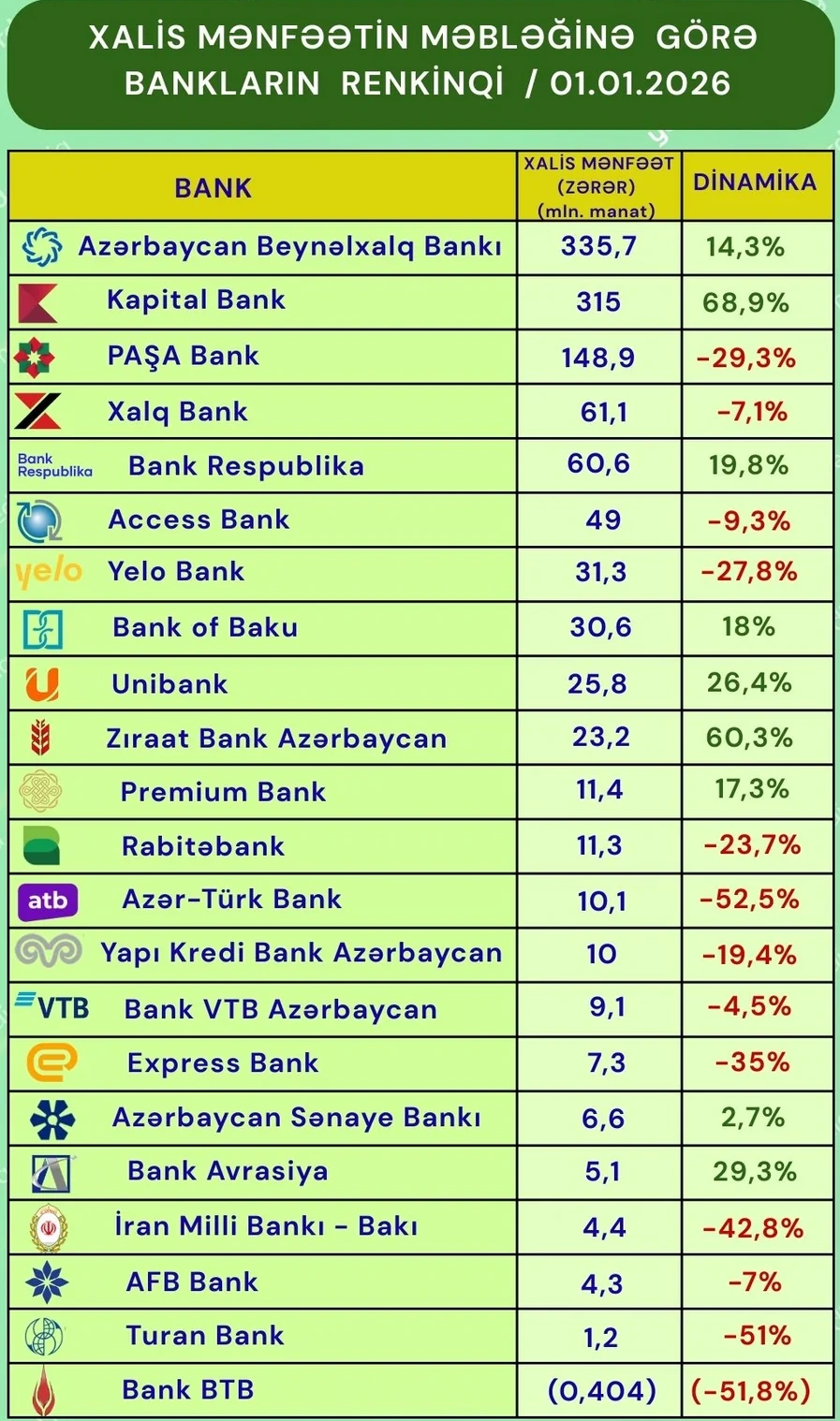 Son 1 ildə 22 bankdan 9-nun (xalis) mənfəəti artıb. Ən yüksək dinamika “Kapital Bank”da (68,9%), ən aşağı dinamika isə “Azərbaycan Sənaye Bankı”nda (2,7%) qeydə alınıb.