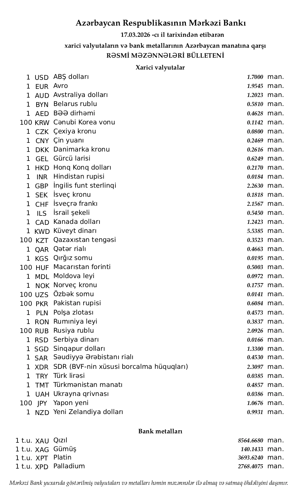 Rəsmi məzənnələr açıqlandı.