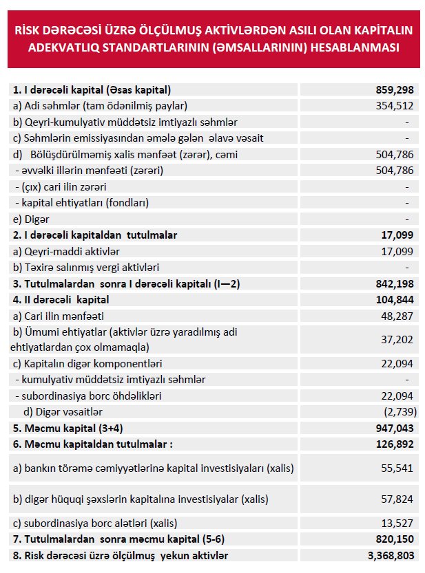 Hesabat dövründə mümkün zərərlər üçün yaradılan məqsədli ehtiyatlara ayırmalar da azalıb. 2026-cı ilin ilk rübündə bank bu məqsədlə 4 milyon 570 min manat ayırıb. 2025-ci ilin eyni dövründə isə ehtiyat ayırmaları 5 milyon 138 min manat təşkil edirdi. Bu isə 568 min manat və ya 11,1 % azalma deməkdir və kredit portfelində risklərin stabil olduğunu göstərir.