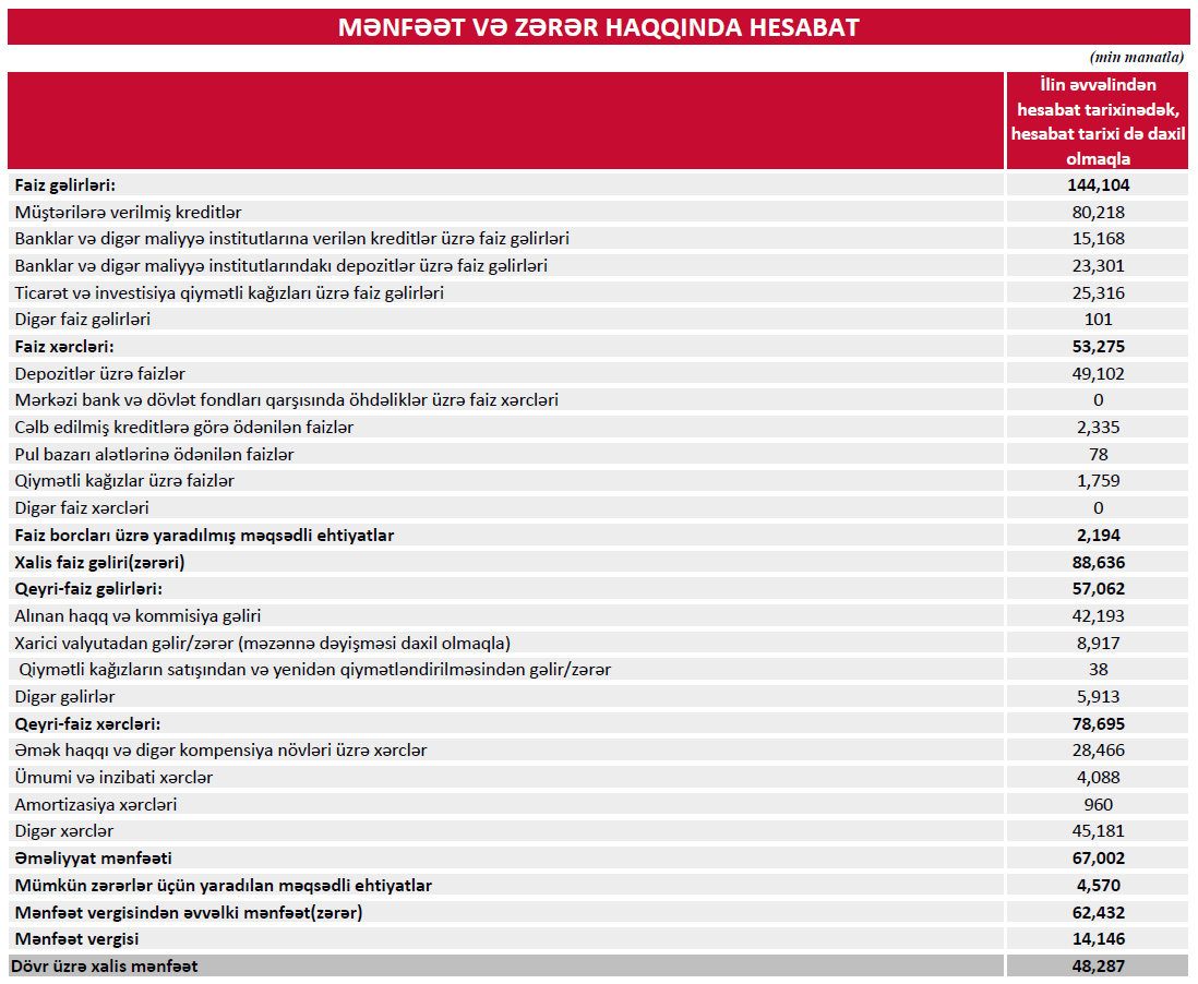 Bununla yanaşı, bankın qeyri-faiz xərcləri əhəmiyyətli dərəcədə azalıb. 2026-cı ilin ilk rübündə qeyri-faiz xərcləri 78 milyon 695 min manat olub. 2025-ci ilin eyni dövründə isə bu göstərici 112 milyon 488 min manat idi. Beləliklə, qeyri-faiz xərcləri 33 milyon 793 min manat və ya 30 % azalıb. Bu, azalma bankın ümumi və inzibati xərclərinin kəskin azalmasının nəticəsidir.