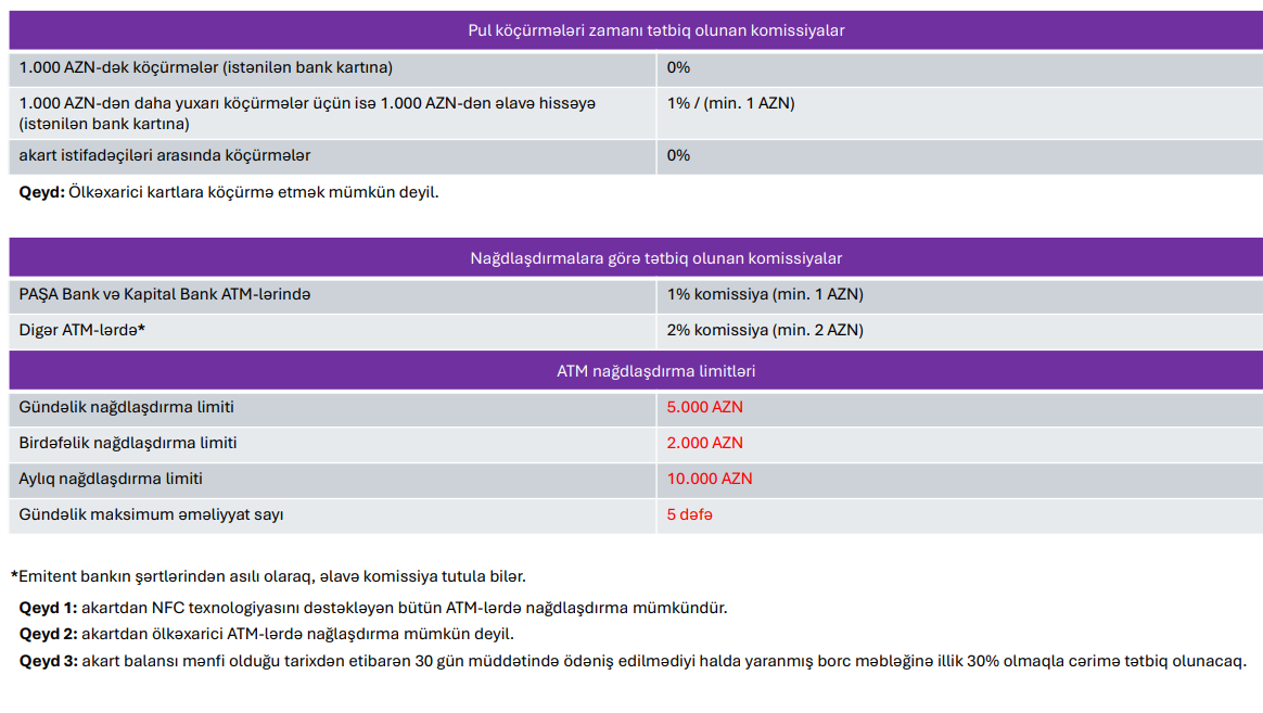 ATM nağdlaşdırma limitləri üzrə - gündəlik nağdlaşdırma limiti 5000 AZN. birdəfəlik nağdlaşdırma limiti 2000 AZN, aylıq nağdlaşdırma limiti 10000 AZN gündəlik maksimum əməliyyat sayı 5 dəfə müəyyən olunub.