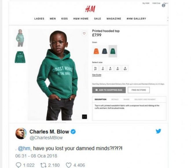 İsveçin geyim nəhəngi H&M, internet saytında satılan və qara bir uşağın geyindiyi köynəyin üzərində "meşənin ən cəlbedici meymunu" ("Coolest monkey in the jungle") yazması ilə əlaqədar olaraq irqçilikdə günahlandırılıb.