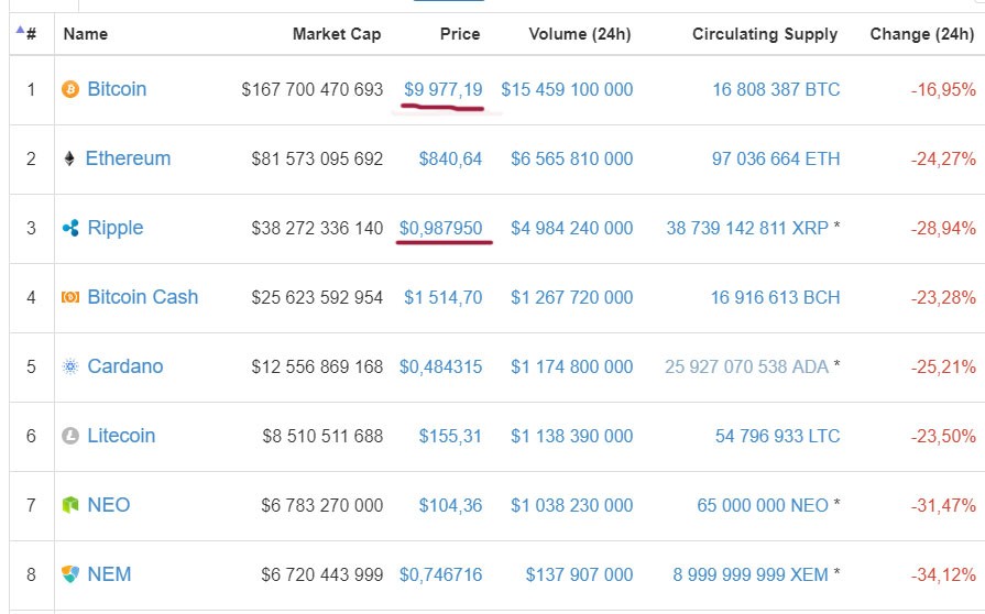 Bitcoin ilə bərabər, Ripple və Ethereum daxil digər virtual pullar da kəskin ucuzlaşıb. Ripple-ın qiyməti 1 dollardan da aşağı düşərək 0,98 dollar olub.