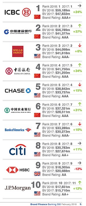 Dünyanın marka dəyəri ən yüksək ilk 10 bankı arasında Çindən 4, ABŞ-dan 5, İngiltərədən bir bank var.