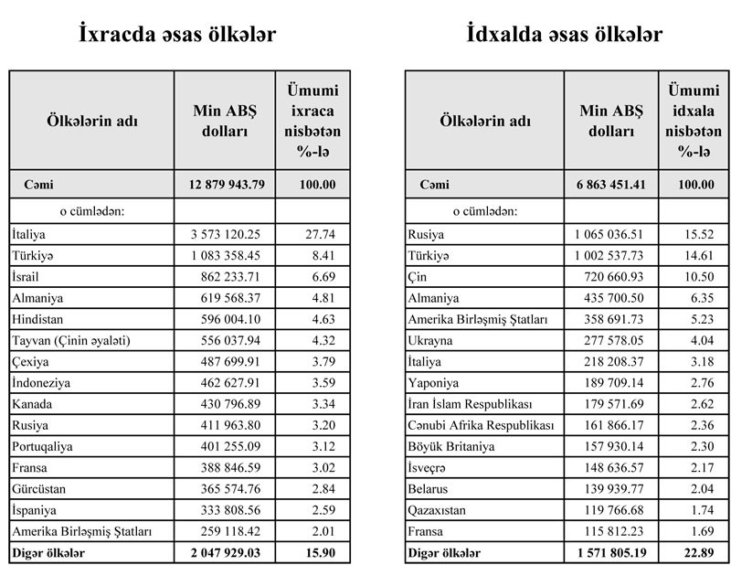 Belə ki, cari ilin yanvar-avqust aylarında Azərbaycan Rusiyadan 1 milyard 65 milyon dollarlıq, Türkiyədən isə 1 milyard 2 milyon dollarlıq mallar idxal edib. Rusiyadan idxal ümumi idxalın 15.52%-ni, Türkiyədən idxal isə 14.61%-ni təşkil edib.