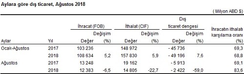 Türkiyə Statistika Komitəsi və Ticarət Nazirliyinin birgə məlumatına görə, ixrac 2018-ci ilin Avqust ayında, 2017-ci ilin eyni ayı ilə müqayisədə 6,5% azalaraq 12 milyard 383 milyon dollar, idxal 22,7% azalaraq 14 milyard 805 milyon dollar təşkil edib.