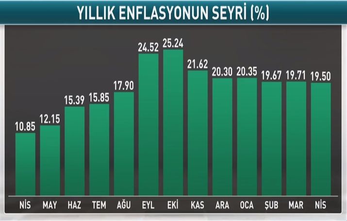 Türkiyə Statistika Komitəsinin məlumatına görə, ölkədə qiymətlər (inflyasiya) Apreldə aylıq 1,69%, illik 19,50% artıb.