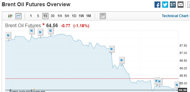 "Marja" xəbər verir ki, Bakı vaxtı ilə saat 08:30-a olan məlumata görə, Brent nefti 1,2% ucuzlaşma ilə 64,58 dollardan alıcı tapıb. ABŞ xam nefti isə 1,1% də ucuzlaşaraq 55.98 dollara düşüb.