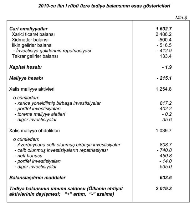 Xəbər verdiyimiz kimi, 2019-cu ilin I rübü üzrə tədiyə balansıda 1.6 mlrd. dollar profisit yaranıb. Ümumi profisiti həm neft qiymətinin yüksək olması,həm də Cari Əməliyyatlar Balansında yaranmış müsbət tendensiyalar hesabına formalaşmışdır.