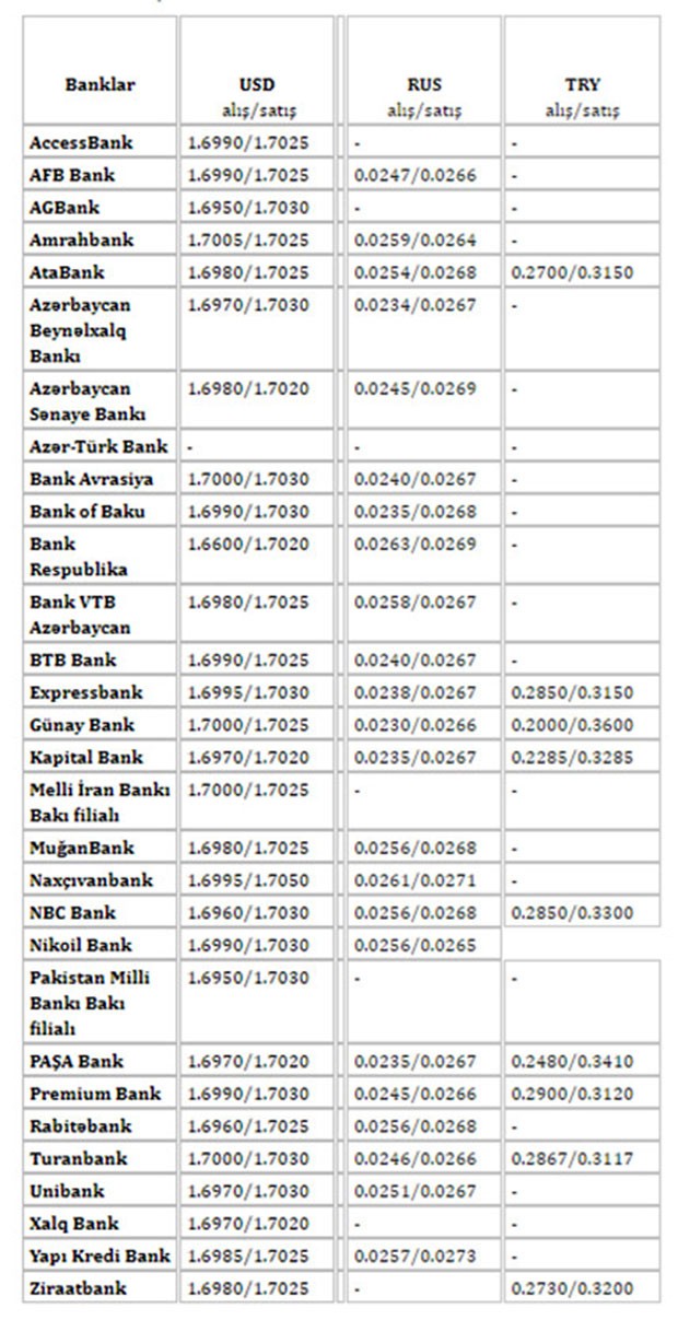 Azər-Türk Bank | 1.6990 | 1.7025 | 1.8410 | 1.8940 |