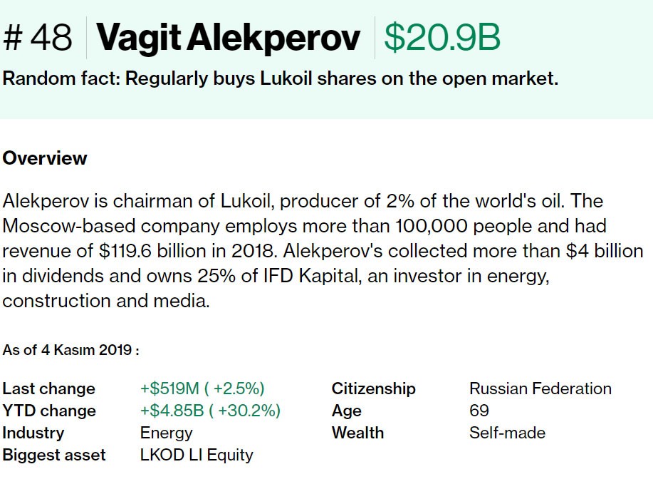 Azərbaycan əsilli rusiyalı iş adamı, “Lukoyl” şirkətinin prezidenti Vahid Ələkbərovun sərvəti son 24 saatda 519 milyon dollar, son 1 ayda 2.4 milyard dollar, son 1 ildə isə 4.85 milyard dollar artıb.