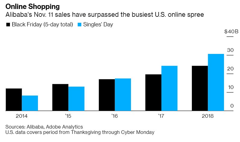 Çinin iri elektron ticarət şirkəti "Alibaba", alış-veriş çılğınlığının yaşandığı "Subaylar Günü"ndə yeni bir rekorda imza atıb. Satışlar bu əlamatdar gündə 38,3 milyard dollar (268 milyard yuan) təşkil edib, bu keçən ilin rekord səviyyəsindən 26% yüksəkdir.