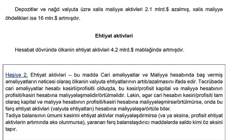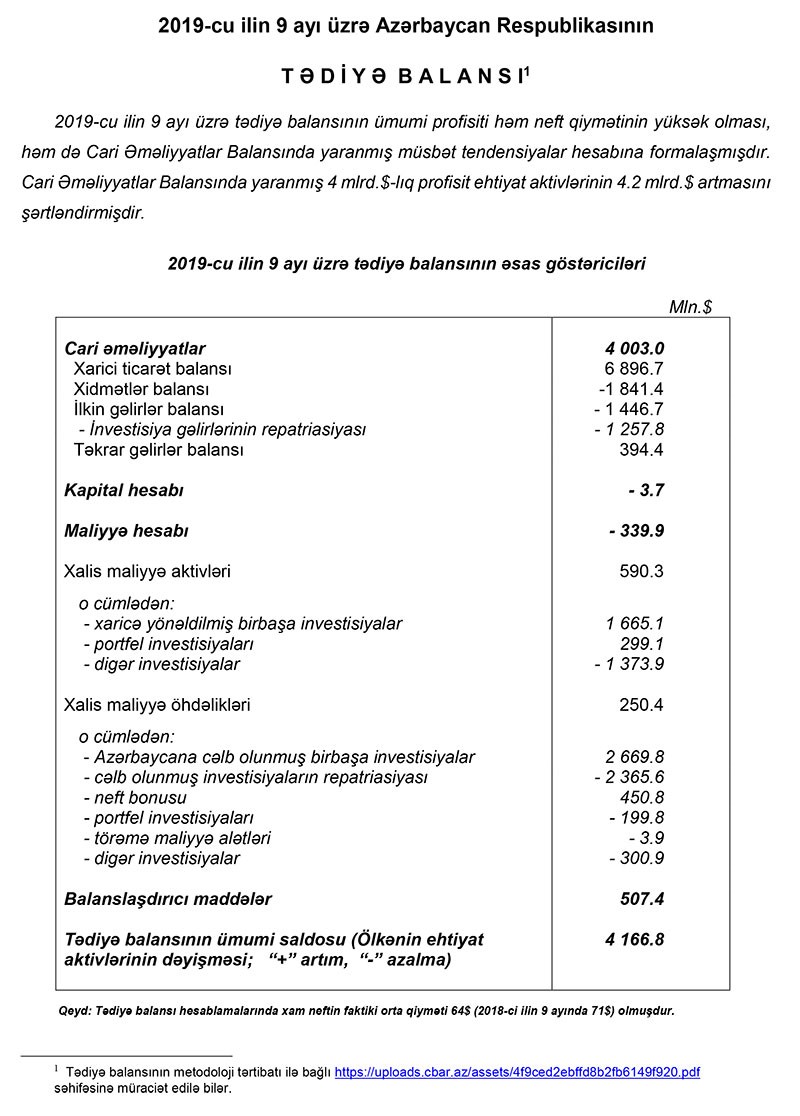 “2019-cu ilin 9 ayı üzrə tədiyə balansının ümumi profisiti həm neft qiymətinin yüksək olması, həm də Cari Əməliyyatlar Balansında yaranmış müsbət tendensiyalar hesabına formalaşmışdır. Cari əməliyyatlar Balansında yaranmış 4 mlrd dollarlıq profisit ehtiyat aktivlərinin 4.2 milyard dollar artmasını şərtləndirmişdir”,- Mərkəzi Bankın məlumatında deyilir.