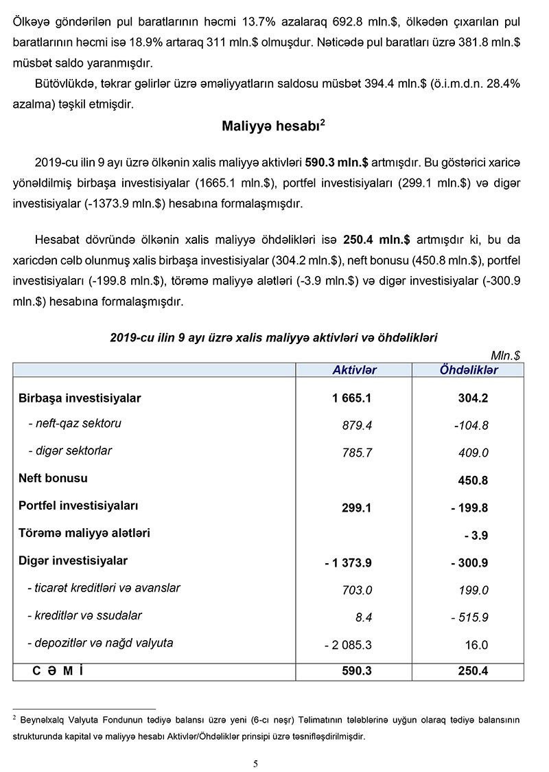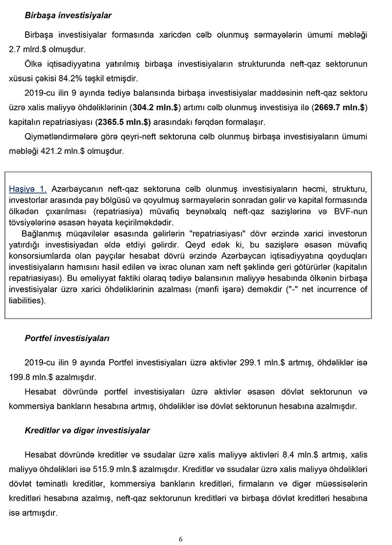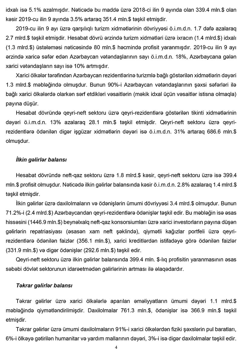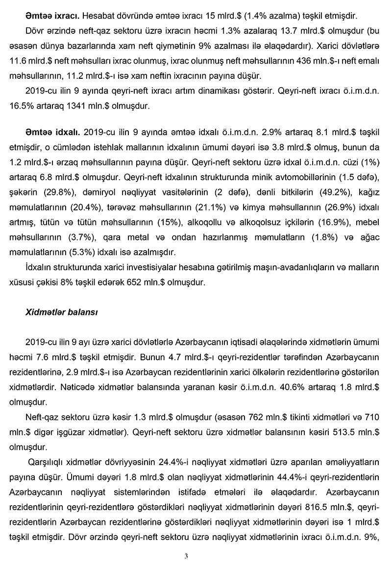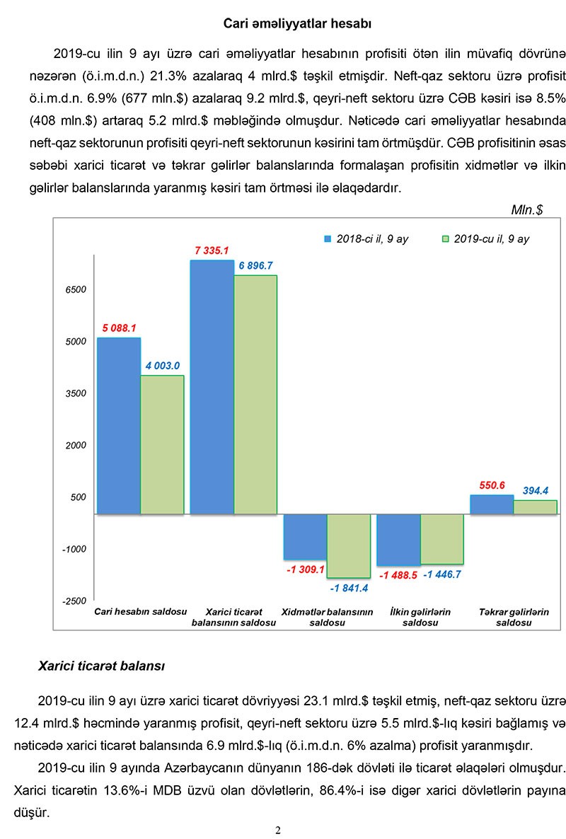 Mərkəzi Bankın məlumatında qeyd edilib ki, 2019-cu ilin 9 ayı üzrə cari əməliyyatlar hesabının profisiti ötən ilin müvafiq dövrünə nəzərən (ö.i.m.d.n.) 21.3% azalaraq 4 milyard təşkil etmişdir. Neft-qaz sektoru üzrə profisit ö.i.m.d.n. 6.9% (677 milyon dollar) azalaraq 9.2 milyard dollar, qeyri-neft sektoru üzrə CƏB kəsiri isə 8.5% (408 milyon dollar) artaraq 5.2 milyard məbləğində olmuşdur. Nəticədə cari əməliyyatlar hesabında neft-qaz sektorunun profisiti qeyri-neft sektorunun kəsirini tam örtmüşdür. CƏB profisitinin əsas səbəbi xarici ticarət və təkrar gəlirlər balanslarında formalaşan profisitin xidmətlər və ilkin gəlirlər balanslarında yaranmış kəsiri tam örtməsi ilə əlaqədardır.