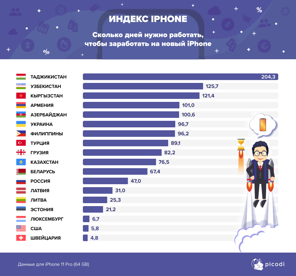 Антирекорд принадлежит Таджикистану: здесь среднестатистический житель должен откладывать на новый iPhone 204 дня. В таких странах как Германия и Франция новый гаджет равнозначен по стоимости 9,9 и 10,9 рабочих дня.