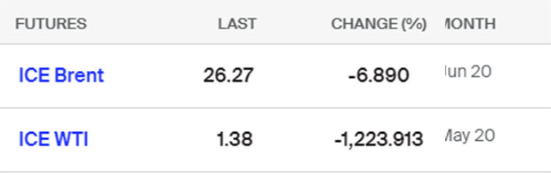 Marja xəbər verir ki, Bakı vaxtı ilə saat 21:42-də Brent nefti 6,9% ucuzlaşma ilə 26,27 dollardan, Qərbi Texas nefti (WTI) isə 1223% ucuzlaşma ilə 1,38 dollardan alıcı tapıb.