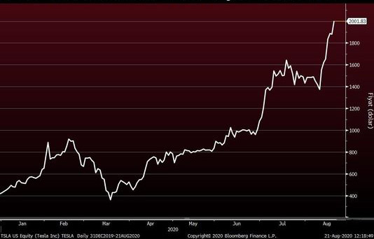 Dünən 6.6% müsbətdə 2001 dollar ilə rekord səviyyədən bağlanan Tesla səhmləri, keçən ilin eyni dövrü ilə müqayisədə 10 dəfə bahalaşıb.