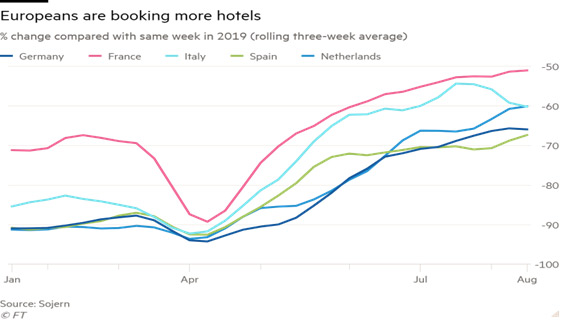 Xüsusən turizm sektoru daha böyük sürət götürüb. Ən iri turizm bölgələrindən olan İspaniyada bu mövsüm hotellərin 50%-dən çoxu pandemiyadan sonra ilk dəfə dolub. Kirayələr üzrə məlumat şirkəti AirDNA-nın məlumatıan görə, Almaniya, İtaliya, Portuqaliya və İspaniyada qısamüddətli rezervasiyalar hələ 2019-cu ilin səviyyəsinə çatmasa da, sürətlə artır.