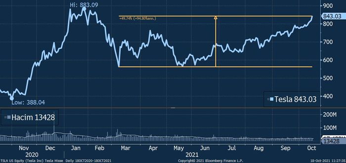 Elektromobil istehsalçısı Tesla şirkətinin səhmləri 8 Martda bu ilin ən aşağı səviyyəsini gördükdən sonra 50% bahalaşaraq 18 Oktyabrda 843 dollara çatıb.