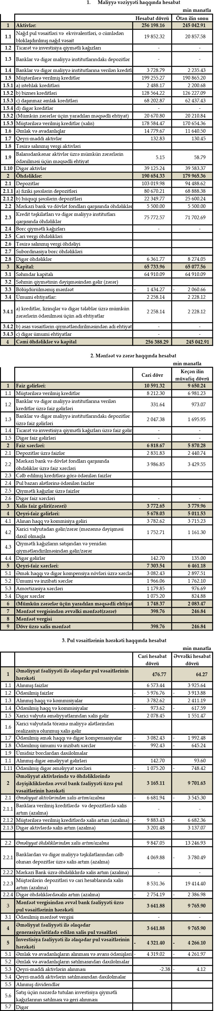 Müqayisə üçün qeyd edək ki, 2020-ci ilin yanvar-sentyabr dövründə “Günay Bank” ASC-nin cəmi əməliyyat gəlirləri 14 milyon 662 min manat, cəmi əməliyyat xərcləri 12 milyon 331 min manat, əməliyyat mənfəəti 2 milyon 330 min manat təşkil etmişdi. Bank əməliyyat mənfəətindən 2 milyon 83 min manat mümkün zərərlər üçün yaradılan məqsədli ehtiyata ayırdığında həmin dövrü 247 min manat xalis mənfəət ilə bağlamışdı.