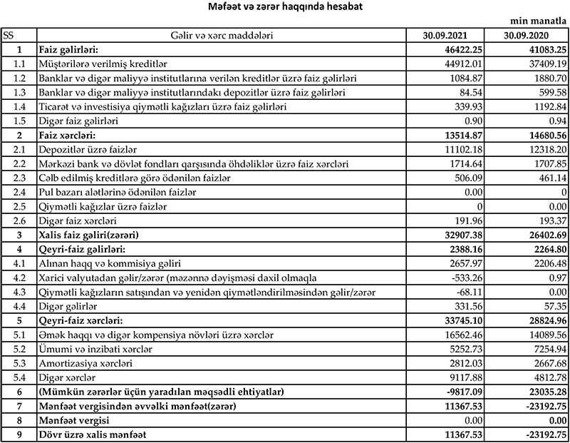 2020-ci ilin 9 ayını (yanvar-sentyabr dövrünü) 23 milyon 193 min manat xalis zərər ilə başa vurmuş “Yelo Bank” ASC, 2021-ci ilin 9 ayını 11 milyon 367 min manat xalis mənfəət ilə bağlayıb. Xalis mənfəətin böyük hissəsi ehtiyatdan azad olmuş vəsait ilə əlaqədardır.
