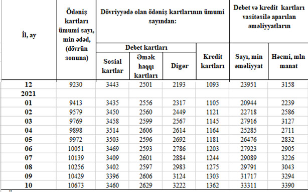 2021-ci ilin 10 ayı ərzində ödəniş kartlarının ümumi say 1 milyon 443 min ədəd artıb. Bu il əməkhaqqı kartlarının sayı 128 min ədəd, kredit kartlarının sayı isə 269 min ədəd artıb.