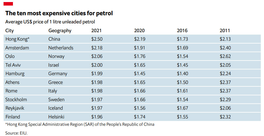 Marja.az Böyük Britaniyanın “The Economist Group” şirkətinin analitikləri tərəfindən hazırlanan dünyanın 173 iri şəhərində yaşayış minimumu (Worldwide Cost of Living 2021) araşdırmasına itinadən xəbər verir ki, ən baha benzin Honq Konqdadır. Bu şəhərdə 1 litr benzinin orta qiyməti 2,50 dollardır (4,25 manat).