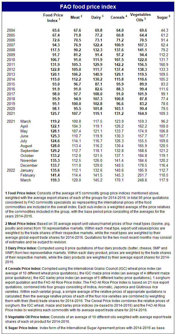 FAO Bitki Yağı Qiymətləri İndeksi mart ayında aylıq müqayisədə 23,2 faiz artaraq 248,6 bəndlə yeni rekorda imza atıb. İndeksin kəskin yüksəlməsinə günəbaxan, palma, soya və kolza yağının qiymətlərindəki artım səbəb olub. Beynəlxalq günəbaxan yağının qiymətləri mart ayında Qara dəniz regionunda davam edən münaqişə ilə ixrac tədarükünün azalması səbəbindən əhəmiyyətli dərəcədə artıb.