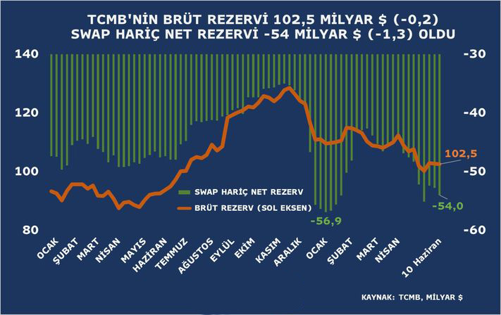 TCMB məlumatlarına görə, 10 iyun həftəsində xalis ehtiyatlar 8,2 milyard dollar olub. Ötən həftə xalis ehtiyatlar 10,5 milyard dollar təşkil etmişdi.