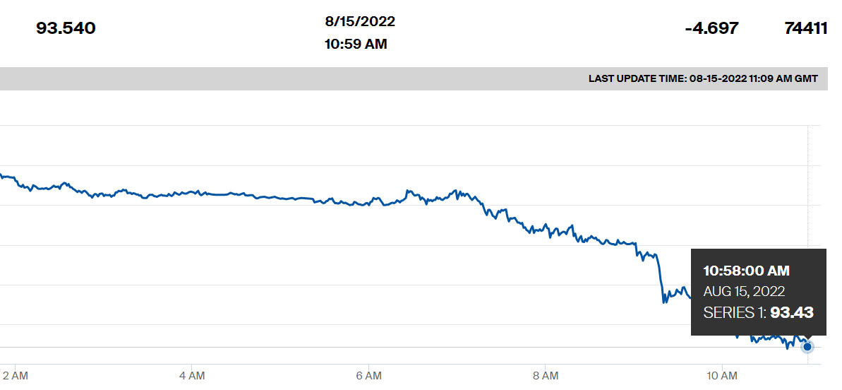 Marja.az xəbər verir ki, Brent neftinin qiyməti 4,7% azalaraq 93,53 dollara düşüb (Bakı vaxtı ilə saat 15:07-yə olan məlumat).